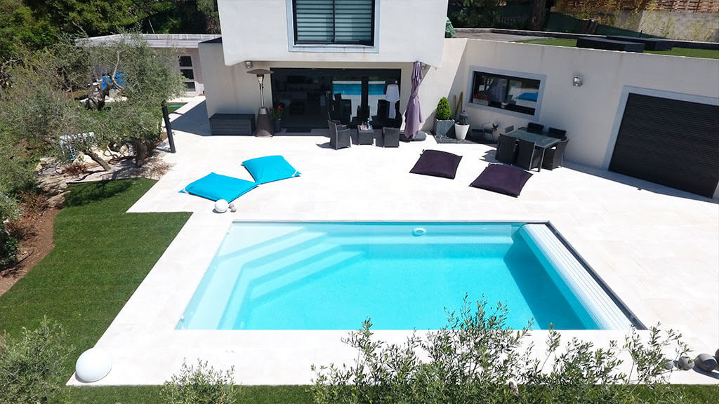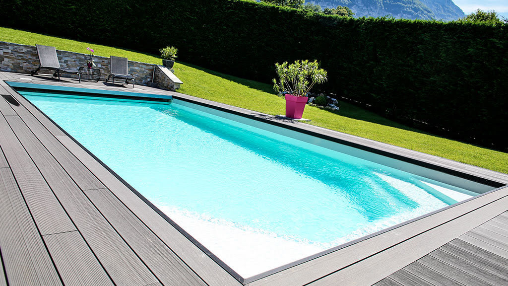Piscine rectangulaire à fond plat — élégance intemporelle, banquette pleine longueur et mise à l'eau sécurisée pour toute la famille