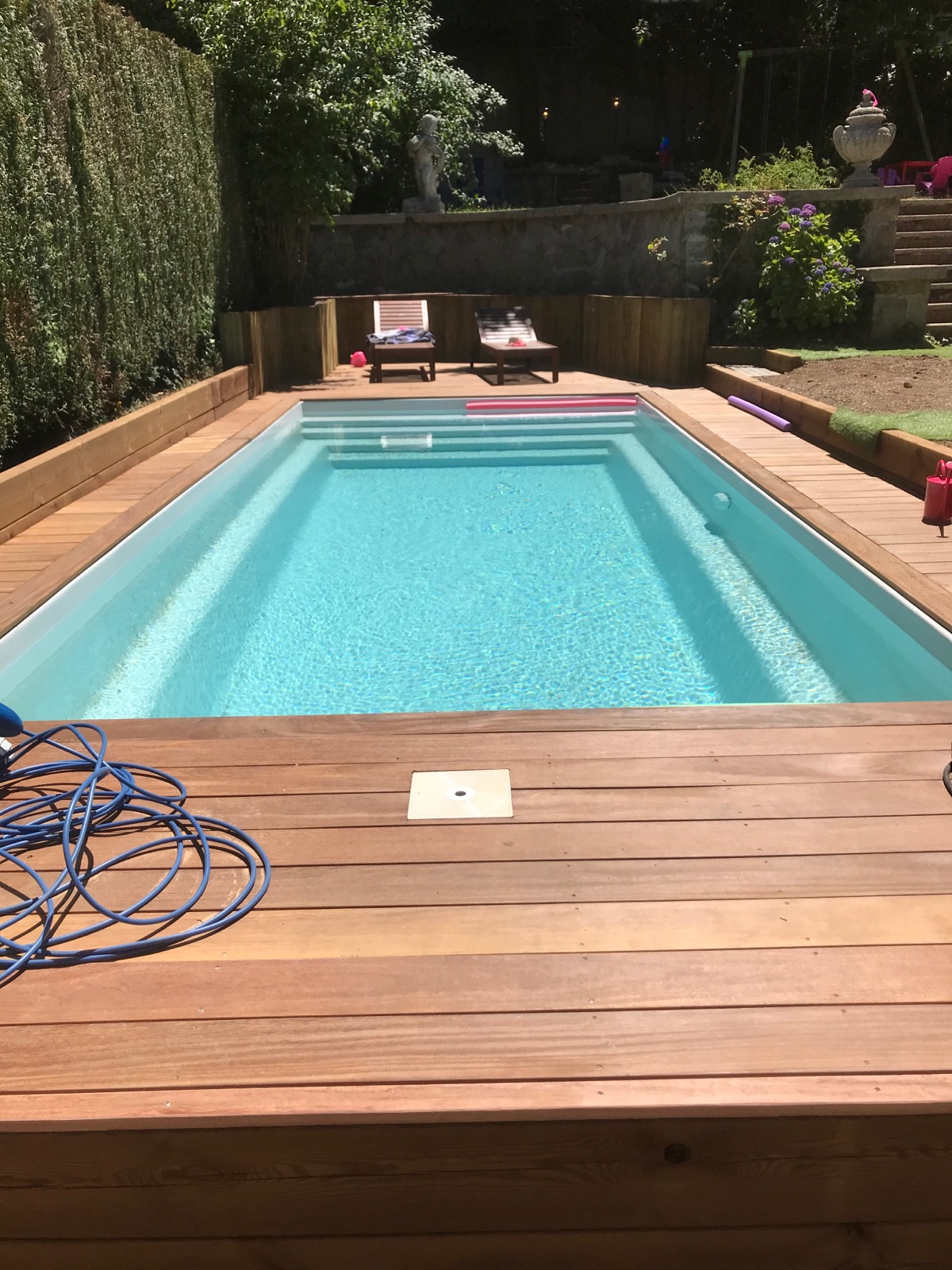 Piscine coque polyester à Saint-Étienne — semi-hors-sol avec terrasse et habillage bois