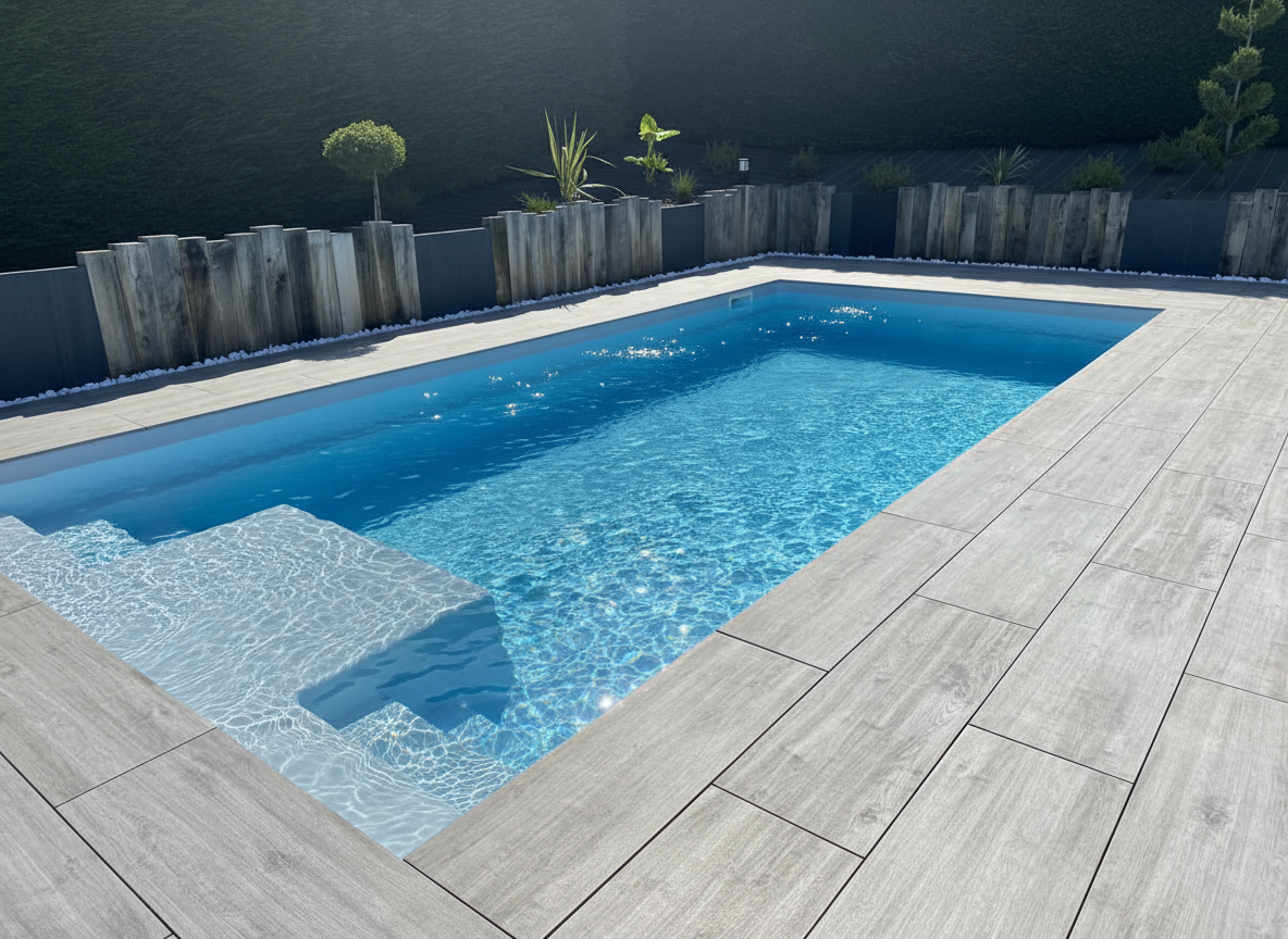 La terrasse en carrelage grand format imitation bois gris clair est le fil conducteur de l'ensemble. Ses grandes dalles posées à joints fins créent une continuité visuelle élégante qui unifie les différents espaces : zone bronzage avec transats, coin repas en arrière-plan et passage perimétraire autour du bassin. Le carrelage porcelainé est antidérapant, imperméable et d'un entretien minimal — un choix idéal pour le pourtour d'une piscine.